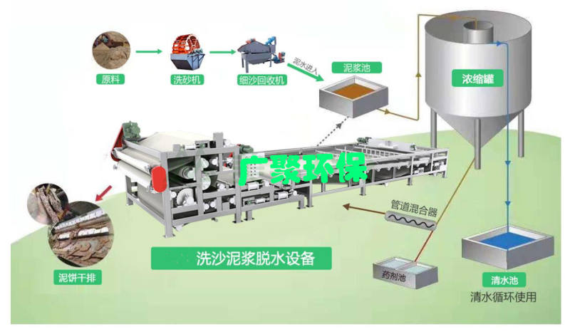 洗沙污泥(污水)废水的处理无外乎就是进行泥水分离,通过物理的方法将泥沙分离出来,由于洗沙废水含泥沙量较大,先用初沉池自然沉降的办法将细沙沉淀下来,进而控制进入加药絮凝环节的含固量,以达到降低药剂成本投资的目的,然后通过添加絮凝剂,形成颗粒沉淀,上清液进入清水池回用,下层淤泥进入污泥脱水设备,泥饼外运处置。