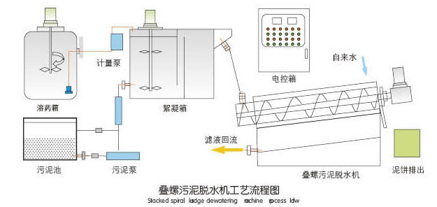 叠螺式污泥脱水机的工作原理是由固定环和游动环的相互叠加,螺旋轴贯穿其中形成的过滤装置推动.前段为浓缩段,后段为脱水段.在前进的过程中随着滤缝及螺距的逐渐变小,以及背压板的阻挡作用下,产生极大压力,容积不断缩小,达到充分脱水的目的。